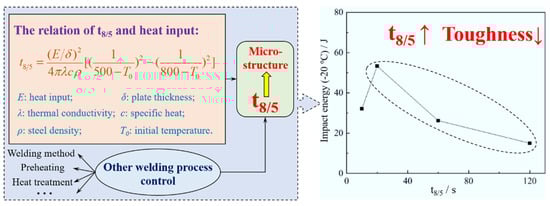 Influence factors of t8/5 and its relationship with low temperature impact toughness of HAZ. (Reproduced with permission from []. Copyright 2013 Elsevier Publications.)