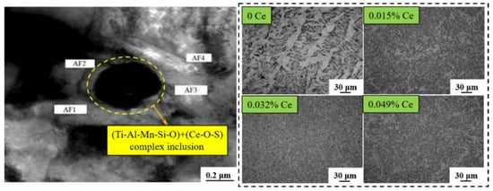 Through welding E36 steel with RE welding wire, Yu et al. [] found that the inclusions in the weld metal were the composite inclusions of (Ti-Al-Mn-Si-O) + (Ce-O-S) with the diameter of 0.5 μm, and the AF was induced by them, as shown in Figure 6. In addition, the areas of AF in the weld metal were also increasing with added RE content, which could reach 85% when the Ce content was 0.032%, and the impact energy at −40 °C exceeded 82 J. Deng et al. [] studied the evolution of inclusions in steel and the nucleation mechanism of AF through experiments and thermodynamic calculations. It was concluded that (Mn-Al-Si-Ti-La-Ce-O) + MnS composite inclusions could be used as the particle of AF nucleation. The studies of Thewlis and Xue et al. [,] also indicated that the morphology and distribution of inclusions were improved by RE, and RE inclusions could induce AF nucleation easily, refine the microstructure of weld metal, and improve the weldability of steel. Moreover, Cao et al. [] observed that the disperse RE inclusions in HAZ pinned the grain boundary and were beneficial to grain refinement after adding Ce into X70 steel. Some research studies of RE oxide metallurgical technologies are shown in Table 1.