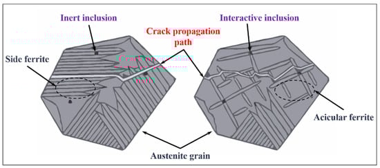 The propagation path of cleavage crack of AF nucleated by RE inclusions is different from that of FSP. As shown in Figure 7, the FSP has the sheet structure parallel to the crystal orientation, which can provide a better path for crack propagation and reduce the crack propagation energy. However, the structure of AF lath crosses each other, which has a strong effect of hindering crack propagation []. Consequently, the fracture toughness of steel is improved with the increase of AF.