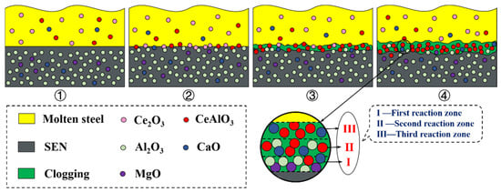 Schematic diagram of clogging formation in SEN. ① Inclusion suspension, ② Inclusion reaction, ③ Clogging formation, ④ Clogging aggregation (Reproduced with permission from []. Copyright 2021 Springer Nature Publications.)