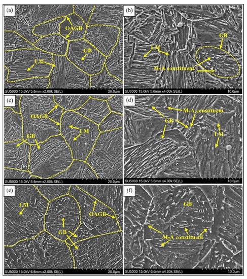 Microstructure of HAZ in high strength steel: (a,b) 3.9 kJ/cm; (c,d) 5.2 kJ/cm; (e,f) 7.75 kJ/cm. (Reproduced with permission from []. Copyright 2017 Elsevier Publications.)
