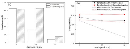 Mechanical properties of HAZ in Ce-free and Ce-containing steel: (a) effect of heat input on impact energy; (b) effect of heat input on strength. (Reproduced with permission from []. Copyright 2021 Taylor & Francis Publications.)