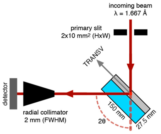 A 3 mm diameter circular slit in the primary beam and a radial collimator with a full width at half maximum (FWHM) of 2 mm on the diffracted beam side defined the gauge volume, as shown in Figure 3.