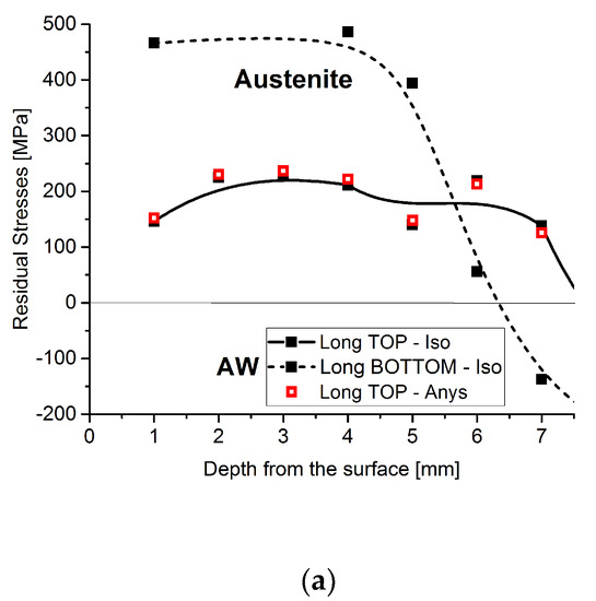 Figure 14 shows that there are differences between the longitudinal residual stresses measured by the two methods, mainly in the areas close to the surface of the coated plate. These differences are more significant in the zone of interaction between adjacent welds (BOTTOM), Figure 14b, although they approximate in the zone of interface between the weld and the base material. The comparison between Figure 14a,b shows that the distribution of the welds influences the value and profile of the installed residual stresses. On the other hand, the unexpected very low tensile stresses for the AW sample, measured by the contour method, see Figure 14a,b, in the austenitic layers of the cladding can only be attributed to plasticity effects which may be present at the tip of the cut. The procedure associated with the contour method is highly sensitive to the quality of the sectioning cut, and mistakes linked to the plasticity produced by stress redistribution ahead of the WEDM wire during the cutting process have been witnessed in some situations [31,32]. One can infer that the material is plastically deformed in the cladded layers from the stress magnitudes calculated by neutron diffraction, see Figure 6. They are above the nominal yield strength of austenite, approximately 300 MPa. This effect does not appear under compression since the yield strength of austenitic steel under compression is much higher. The plastic effect is usually connected to the strain resulting from the phase transformations, such as austenite to martensite in stainless steel [33].
