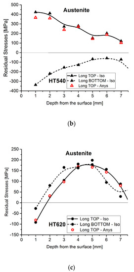 Evolution of longitudinal residual stress in depth of the austenitic cladded layers at the TOP and BOTTOM positions for each sample: (a) AW, (b) HT540, and (c) HT620. For comparison, the residual stress values for the TOP positions using anisotropic elastic constants are also shown, in legend shown by Long TOP-Anys.