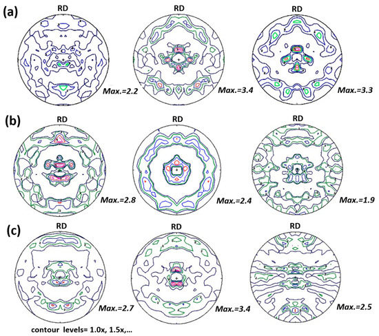 Calculated pole figures in depths of the diffraction plane {311} for (a) as weld sample (AW) and heat-treated samples (b) HT540 and (c) HT620. For (a–c) the left-hand pictures were measured at 2 mm depth, the middle ones at 5 mm depth and the pictures on the right-hand side were acquired at 7.5 mm depth.
