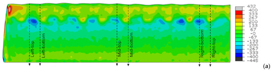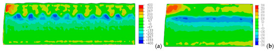 The maps of the residual stress state measured for the understudy samples in the longitudinal and transverse directions are plotted in Figure 8, Figure 9 and Figure 10.