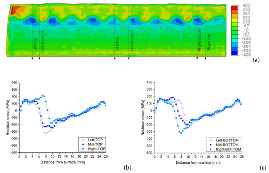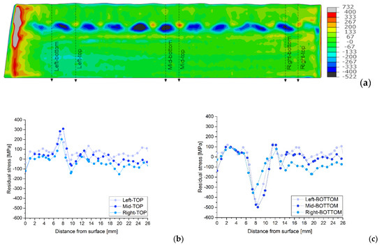 Longitudinal residual stress map for AW (a) and profile details at selected TOP (b) and BOTTOM (c) positions, indicated in the respective maps.