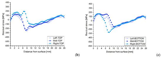 The variations in the stress profiles with the positions on the plate can be seen clearly in Figure 11, Figure 12 and Figure 13 for each sample, AW, HT540 and HT620 respectively. The residual stress profiles in depth for similar topological positions, TOP, and BOTTOM, on the left, middle and right side of the plates are plotted together for the longitudinal direction and each sample.