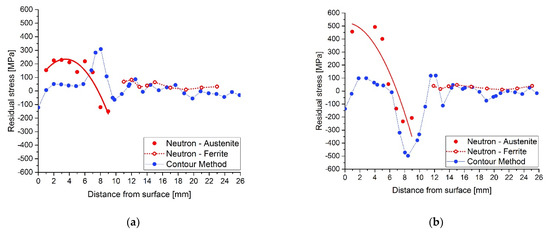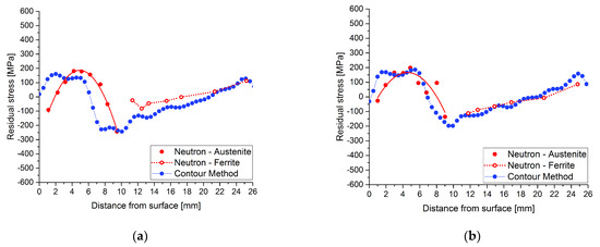 For both samples and in the base material, the residual stress values show an excellent agreement between both methods. This is often the case as shown by various comparative studies of both methods [23,34,35,36,37]. Some differences occur at the interface between the parent ferritic steel and austenitic cladded layers. For the AW sample, see Figure 14, the residual stress values acquired from the neutron diffraction are in general higher than those obtained by the contour method. This has been recognized by different authors and is related to the microstructure of the materials, such as steel materials [38] and magnesium alloys [39].