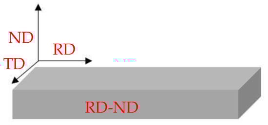 The samples were surface-grinded with silicon carbide sandpaper from 200 mesh to 5000 mesh and mechanically polished with 0.5 µm diamond spray polishing agent, samples for EBSD measurements need to be further polished with argon ion. The microstructure, grain orientation, grain boundary distribution, and grain size on the rolling direction (RD) and normal direction (ND) plane at the mid-width of the sample were observed by the MM-6 optical microscope (OM, produced by Shanghai Optical Instrument Factory No.6, Shanghai, China) and Electron Backscattered Diffraction (EBSD). EBSD analysis was carried out on using ZEISS-Sigma500 scanning electron microscope equipped (Zeiss Germany, Jena, Germany) with an Oxford-symmetry accessory. The grain orientation on the RD–ND plane was analyzed by Philips PANalytical X-ray Diffraction (XRD) unit (PW3373, Almelo, The Netherlands) with Cu-Kα radiation. The hardness (HV0.3) was tested by an HVS-1000A Vickers microhardness tester(Huayin Test Instrument Co. LTD, Laizhou, China), which indirectly reflected the recrystallization during the annealing process; the load of the microhardness tester was 3 N and the load time was 10s. The RD-ND surface of Er samples was shown in Figure 2.
