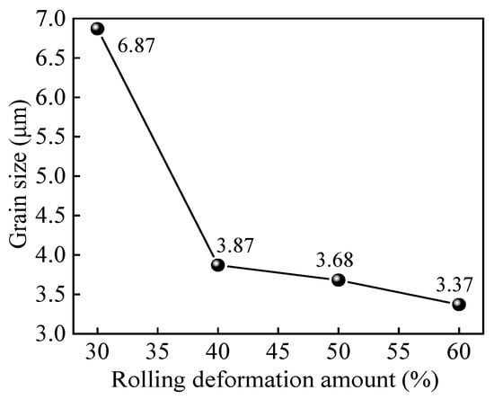 Figure 5 is the relationship curve between deformation and average grain size. The average grain size of Er decreases from 6.87 µm at 30% deformation to 3.87 µm at 40% deformation rapidly. When the deformation is greater than 40%, the average grain size slowly decreases from 3.87 µm at 40% deformation to 3.37 µm at 60% deformation, combined with the fine microstructure in Figure 4d, which indicates that grains are almost broken and refined completely after 60% cold rolling deformation.