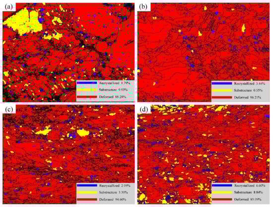 Figure 6 and Table 1 show the distribution of the grain characteristics of the Er after cold rolled deformations. It is observed that the deformation area accounts for 88.28%, and the recrystallized grains area accounts for 1.79% when the deformation is 30%. After rolling at 40% deformation, the deformation area increases to 96.21%. Moreover, when the deformation increases to 50%, the deformation area is 94.60%, which is approximately the same as that of 40% deformation. However, when rolling deformation increases to 60%, the deformation area drops to 85.09% and the recrystallized area increases to 6.60%. Therefore, it is concluded that the degree of deformation first increases, then stabilizes, and then gradually decreases, and the degree of deformation gradually decreases because the freshly recrystallized grains replace the original deformed microstructure, which is consistent with the results in Figure 4.