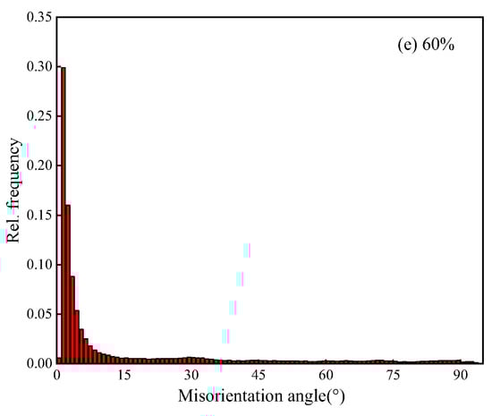 Figure 7 is the misorientation distribution of Er metal. It is observed that most of the misorientation angles are high-angle grain boundaries (θ > 15°), and there are few low-angle grain boundaries (0° < θ < 15°) in the initial as-cast metal. The high-angle grain boundaries gradually decrease and the low-angle grain boundaries gradually increase with deformation increasing. After 50% cold-rolled deformation, the content of low-angle grain boundaries increases to 83.25%. When the deformation increases to 60%, the low-angle grain boundaries reduce to 79.34%. A greater low-angle grain boundary content reflects that there will be greater degree of deformation and dislocation density [29,30]. Therefore, the results show that the increase trend of deformation degree and dislocation density is stable after 40% cold-rolled deformation. When the deformation reaches to 60%, the low-angle grain boundaries decrease, which indicates that partial recovery and recrystallization have occurred. This is consistent with the results of Figure 4 and Figure 6.