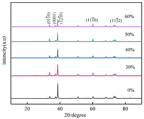 where and are the diffraction intensity of the (H0K0L0) and (H′0K′0L′0), respectively, without preferred orientation. When the orientation index P equals 1, it indicates that there is no preferred orientation, when p deviates from 1, it indicates that the preferred orientation occurs. The greater the deviation, the more obvious the preferred orientation [31,32,33].