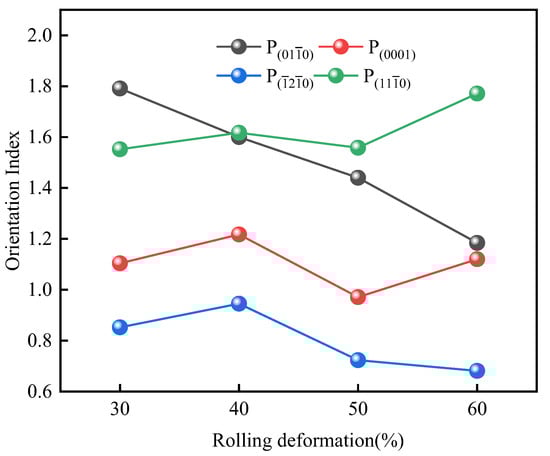 In the present study, I0 is the (112) orientation intensity value in each state, which is selected as the reference for all samples. The calculation results are shown in Figure 9 and Table 2, P(010), P(0001), P(20), and P(110) are the orientation index of (010), (0001), (20) and (110), respectively. It is observed that the value of P(010) decreases from 1.791 at 30% deformation to 1.184 at 60% deformation, which reveals that the crystal orientation of (010) is gradually weakened with the increasing deformation. The value of P(0001) is greater than 1.2 when the deformation is 40% and is constant around 1 on other deformation conditions; this indicates that (0001) plane has a stronger orientation at 40% deformation, but there is no obvious preference under other cold rolling deformation. The value of P(20) is around 1 before 40% deformation, the deviation from 1 is large when the deformation is greater than 50%, but the orientation index is less than 1 at this time, which indicates that the preference orientation remains unchanged in the beginning deformation stage, and then presents a gradual weakened trend after 50% deformation. The value of P(110) is 1.552 at 30% deformation and increases to 1.771 at 60% cold rolling deformation, this indicates that the preferred orientation of the (110) plane is obvious and there is a further enhancement trend with the deformation increases.