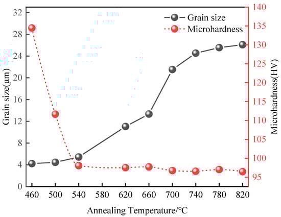The microhardness and average grain size of Er metal with 60% deformation after annealing for 1 h are plotted in Figure 11 and Table 3. When the annealing temperature increases from 460 °C to 540 °C, the grain of Er metal grows slowly, and the hardness decreases from 134.47 HV to 98.03 HV rapidly. This is due to the dislocation density decreases and the stored energy of microstructure decreases during the recovery and recrystallization process [34,35]. As the annealing temperature increases above 540 °C, the hardness tends to be steady and the average grain size rapidly increases from 5.43 µm at 540 °C to 21.52 µm at 700 °C, which is due to the internal stress disappearing and the energy of annealing completely transforms into grain growth. When the temperature reaches to 740 °C, the hardness is maintained at 97 HV and the crystal grain is 24.53 µm; then the grain size and hardness tend to be flat, which indicates that the recrystallization is finished at 740 °C. The grain growth trend is the same as that of the rolled copper target [36]. Moreover, the results of hardness and grain size changes at different annealing temperatures are consistent with the results of microstructure changes in Figure 10. It is concluded that when the deformation is 60%, a high-quality Er target with fine and uniform grains can be obtained after annealing at 740 °C × 1 h.