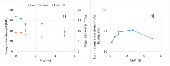(a) Compressive and flexural strength for the samples with different MW (%). The standard deviations are given as error bars. (b) Loss in compressive strength after the heating tests with respect to the initial values.