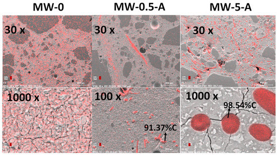 Figure 3 presents the elemental mapping images for carbon (in red) taken by BSE on golden metalized samples for different amounts of MW in the mortars (reference, 0.5, and 5%). At 30 magnifications, all the samples present good aspect, with some air pores in all of them and they were well compacted. At 1000 magnifications, the reference exhibited microcracks all around the mortar. The pieces of masks can be seen as spots (perpendicular to the surface) or fibers, all of them having a percentage of C higher than 90%. They are distributed quite homogeneously in the mortars, not agglomerated but as isolated pieces. Comparing the reference and the MW-5-A mortars at 1000 magnifications, it can be seen that the network of microcracks present in MW-0 disappeared; finding the microcracks radially distributed from the MW portions. The interface between the MW and the cement paste seems to be tight, without appreciable interfacial weakest zones.