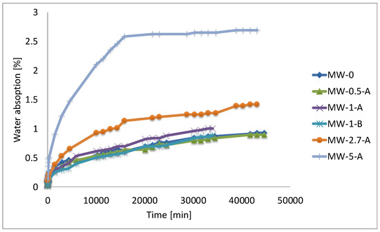 The capillary absorption coefficient for the different samples is given in Figure 6, where it can be seen that increasing WM above 1% makes the capillary adsorption coefficient increases, and, correspondingly, the resistance of the sample to the uptake of water decreases.