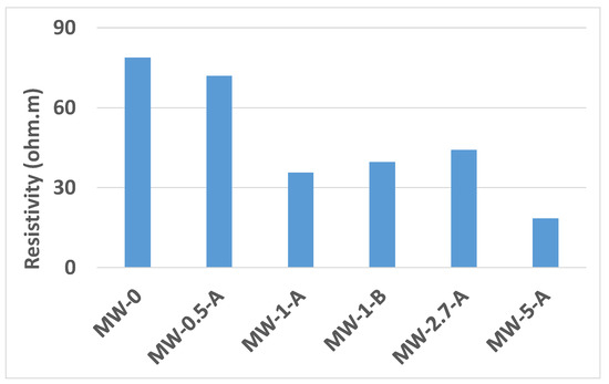 The resistivity of the saturated samples, after 28 days curing, is given in Figure 7, where it can be seen that the reference presents the highest resistivity, in agreement with the results of the rest of durability parameters. The chloride effective diffusion coefficient has been calculated from the resistivity value according to [45], and both coefficients (Deff and Dapp) have been determined for the highest amounts of MW. The results are presented in Table 3, where it can be seen that for the samples including MW, the values calculated from resistivity are higher than those experimentally determined.