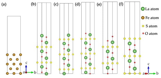 Slab configuration: (a) γ-Fe surface and La2O2S surfaces terminated with: (b) La(O)-terminated; (c) La(S)-terminated; (d) O(La)-terminated; (e) O(O)-terminated; (f) S-terminated. Coordinate dimension a, b and c represent x-axis, y-axis and z-axis respectively.