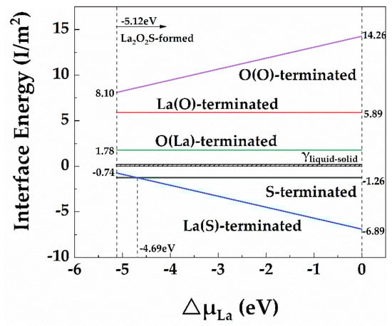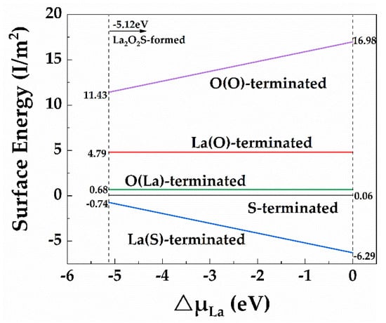 Figure 2 shows La2O2S surface energy varying with the variation of the chemical potential of . Clearly, the surface energy of these surfaces was linearly correlated with . Generally, the lower the surface energy is, the more stable the surface structure is. In the whole range of La chemical potential, the surface energy of the La(S)-terminated surface was the lowest, and the values decreased with the increases of in the range of −0.74 J/m2~−6.29 J/m2. By contrast, the surface energy of La(O)-terminated, O(La)-terminated and S-terminated surfaces remained constant at 4.79 J/m2, 0.68 J/m2 and 0.06 J/m2, respectively. It should be pointed out that the constant value was due to the zero value of () in Equation (10). Therefore, the La(S)-terminated surface was the most stable one over the entire range of chemical potential.