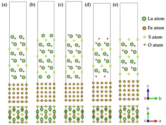 Supercell structures before relaxation: (a) La(O)-terminated La2O2S/γ-Fe interface; (b) La(S)-terminated La2O2S/γ-Fe interface; (c) O(La)-terminated La2O2S/γ-Fe interface; (d) O(O)-terminated La2O2S/γ-Fe interface; (e) S-terminated La2O2S/γ-Fe interface. Coordinate dimension a, b and c represent x-axis, y-axis and z-axis respectively.