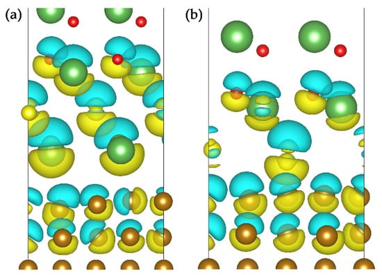 Three-dimensional charge density difference: (a) the La(S)-terminated La2O2S/γ-Fe interface; (b) S-terminated La2O2S/γ-Fe interface. The yellow regions indicate charge accumulation, and the blue regions represent charge loss.