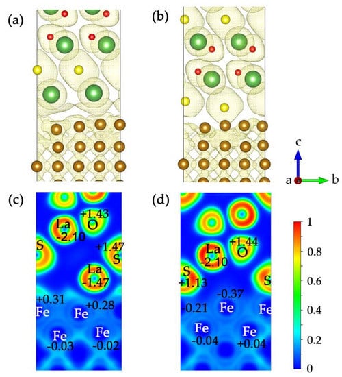 Figure 6 shows the ELF images of the La(S)-terminated and S-terminated interfaces when the isosurface level value was 0.1 eV/Bohr3. Chemical bonds were formed between the different types of interface atoms, and the charge was redistributed after the interface was formed. As shown in Figure 6a,b, the electronic spatial distribution in the atomic layer near the interface differed greatly from that in the innermost atomic layer. Moreover, the extranuclear electron orbitals of the La and S atoms had obvious interactions with that of the Fe atoms at the interface. It can be observed from Figure 6c that there were regions with ELF ≈ 0.3 at the interface. In this case, there was low electron localization, and an ionic bond was formed between the interfaces. Combined with Bader charge analysis, the electrons of La atoms at the interface were transferred to the Fe side, and a metal bond was formed between the interfaces. As shown in Figure 6d, there were green regions with ELF ≈ 0.5 between the S atoms and Fe atoms at the interface. Because of the strong electronegativity of S atoms, the electron loss was mostly concentrated on the Fe atoms at the S-terminated interface, while the electron accumulation was mainly on the S atoms, which contributed to the formation of covalent bonds at the S-terminated interface.