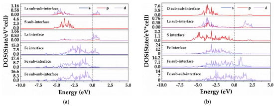 To further investigate the bonding characteristics, the partial density of states (PDOS) was also calculated, as shown in Figure 7. The dashed line indicates the position of the Fermi level. In addition, the DOS near both interfaces was not zero at the Fermi energy, indicating certain metallic characteristics. Obviously, the DOS of the La and Fe atoms at the first layer of the La(S)-terminated interface peaked at Fermi level. The metal characteristics of the La(S)-terminated interface were contributed by La atoms and Fe atoms, while those of the S-terminal interface were made by the Fe atomic contributions. As can be seen from Figure 7a, there was a weak electronic interaction between Fe and La atoms at the La(S)-terminated interface. By comparing the PDOS of different layers of Fe and La atoms, it was found that the d-orbital electrons of the subsurface and bulk La atoms had a more instinct localized feature than the interface La atoms. This suggests that the inner La atoms were more covalent. Moreover, several overlapped peaks appeared between the third layer of La atoms and the second layer of S atoms near the interface, indicating the existence of covalent bonds near the interface. It can be observed from Figure 7b that there was strong electron interaction between Fe atoms and S atoms at the S-terminated interface. In addition, there were some overlapped peaks between Fe-d orbital and the S-p orbital, forming a covalent bond between them at the S-terminated interface. Some overlapped peaks also appeared between the second layer of La atoms and the third layer of O atoms near the interface, which contributed to the formation of covalent bonds near the interface.