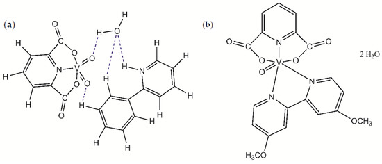 Molecular formulas of (a) [VOO(dipic)](2-phepyH) · H2O and (b) [VO(dipic)(dmbipy)] · 2 H2O.