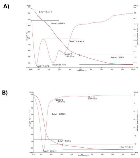 The TG of 2-chloro-2-propen-1-ol oligomers obtained using (A) [VO(dipic)(dmbipy)] · 2 H2O and (B) [VOO(dipic)](2-phepyH) · H2O.