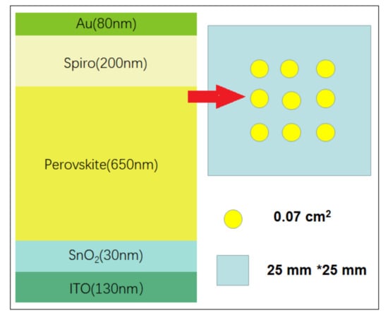 The cell structures of PSCs in this work were designed and manufactured by Xi’an Jiaotong University. As illustrated in Figure 1, the order of layers is ITO (130 nm)/SnO2 (30 nm)/FA0.95Cs0.05PbI3 (650 nm)/Spiro (200 nm)/Au (80 nm). The quartz substrate of the cell was coated with indium tin oxide (ITO) to make the surface transparent and highly conductive, and the thickness of ITO was 130 nm. Metal oxides such as SnO2 are thermally stable and widely employed as electron transport materials (ETMs), and the thickness and composition were formed by tuning the chemical bath deposition of SnO2. For the perovskite absorber, formamidinium (FA) and Cs were chosen as cations with I and Br as halides, as they tend to exhibit high efficiency and robust stability. The organic material Spiro-OMeTAD was deposited as the hole transport materials (HTMs), which must cap the perovskite layer at low temperature to avoid the degradation of PSCs at high temperatures (>80 °C). The cell size was 0.07 cm2, and every 9 samples were packed into a quartz substrate with an area of 2.5 cm × 2.5 cm.