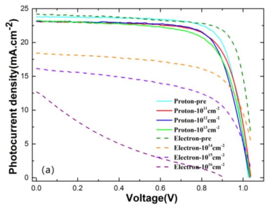 In order to exclude the effects of natural degradation, the response of control groups is illustrated in Figure 2, which shows a relatively small change in current density in the natural environment compared to that in the lab. For each of the irradiation and test runs, the sample quantities were set to 3. The electron irradiation experiments were conducted at the Key Laboratory of Functional Materials and Devices for Special Environments. The energy of the electron beam was continuously adjusted from 1.0 to 2.0 MeV, and the samples directly faced the electron beam to ensure that samples under irradiation received the same dose. The energy of the electron irradiation in this experiment was set to 1 MeV with flux stabilized at 1011 cm−2 s−1, and the fluence ranged from 1014 to 1016 cm−2. We also conducted a proton irradiation experiment with energy of 3 MeV in a vacuum environment using the electrostatic accelerator at Peking University. The flux of proton irradiation can be set to vary from 1.0 × 108 to 6.5 × 108 cm−2 s−1. In this work, the samples were irradiated at fluences of 1.0 × 1011, 1.0 × 1012 and 1.0 × 1013 cm−2, and the flux was stabilized at 1011 cm−2 s−1.