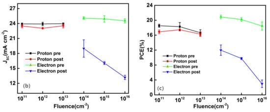 As illustrated in Figure 3a, there was nearly no degradation of the photocurrent density induced by proton radiation, while the degradation induced by electron radiation was more severe than that under proton radiation, especially the photocurrent density with a fluence of 1016 cm−2, which led to a typical device failure. As is clearly shown in Figure 3b, the short-circuit currents of PSCs experienced a significant decrease with accumulating electron fluence, while for proton radiation, there were nearly no significant changes observed in Jsc curves. The parameter PCE% characterizes the photoelectric conversion efficiency of solar cells. As we can see in Figure 3c, PSCs exhibited a relatively stable PCE of 16~20% under proton radiation, but it dropped significantly under electron radiation. With that being stated, it is reasonable to conclude that the PSCs tested in this work are more sensitive to electron irradiation than proton radiation. Previous studies also demonstrated that PSCs can survive against accumulated proton fluence of up to 1.0 × 1014 cm−2 with energies of 50 keV, 100 keV and 68 MeV. In sum, despite the different energies and sample types, the experimental results show similar trends that suggest that PSCs have strong tolerance to proton irradiation. However, previous research with electron radiation showed that PSCs can survive against accumulated dose levels of up to 1.0 × 1016 cm−2 with the same energy of 1 MeV, which is different from the response to electron radiation in our work [8].