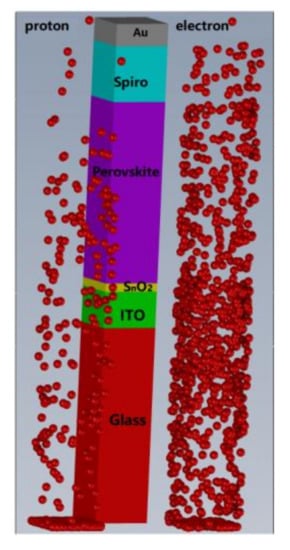 In this work, the Monte Carlo software Geant4 (Geant4.10.06, European Organization for Nuclear Research, Geneva, Switzerland) was used to simulate particle transport in PSCs and further analyze the sensitivity to electron radiation and the tolerance to proton radiation. Geant4 simulation requires several steps, including detector modeling, physical process, particle source and data acquisition. The detector model is shown in Figure 4, which contains six material layers, namely, Glass (700 nm), ITO (130 nm), SnO2 (30 nm), FACsPbI (650 nm), Spiro (200 nm) and Au (80 nm), and the total thickness of the device is 1790 nm. The physical models of electron and proton irradiation were obtained from a standard library and are written in the file PhyListEmStandard.cc. A surface source with an area of 200 nm × 200 nm was used to simulate particle transport in perovskite solar cells, and the initial direction and position are defined in the file PrimaryGeneratorAction.cc. The various stages of particle transport, energy loss calculation and data collection were all controlled by the files SteppingAction.cc, RunAction.cc, etc., [28,29].