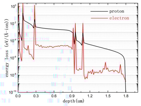 As illustrated in Figure 5, the energy losses of electrons and protons were calculated and found to vary in their distribution with the depth of material layers. As expected, the energy loss of protons was much higher than that of electrons, and the curve of protons was much smoother than that of electrons because of their large stopping cross-section and the greater mass of a proton compared to an electron (>2000 times). An interesting observation is that there were several peaks of energy loss at the interface of different materials. In addition, the energy loss of electrons was about 1 order of magnitude larger than that of protons at the material interface and 2 orders of magnitude smaller than that of protons in the bulk. This indicates that the interface was more sensitive to particle incidents, especially those involving electrons. This may be the reason that the PSCs in this work appeared to be more sensitive to electron irradiation and robust to proton irradiation for the same cell structure.