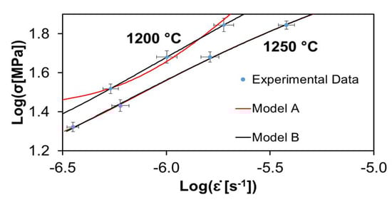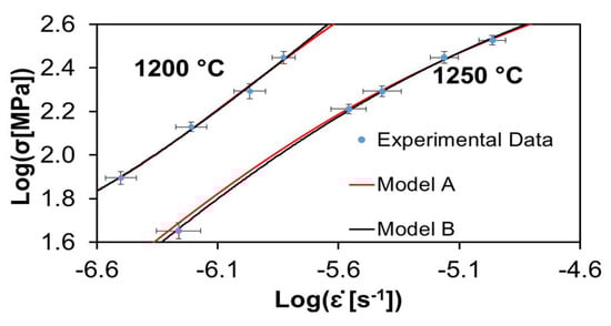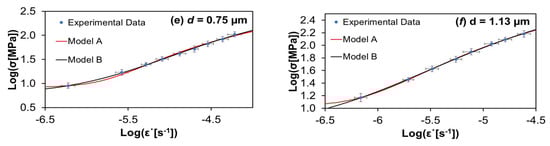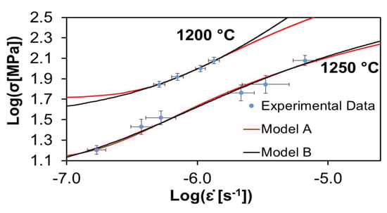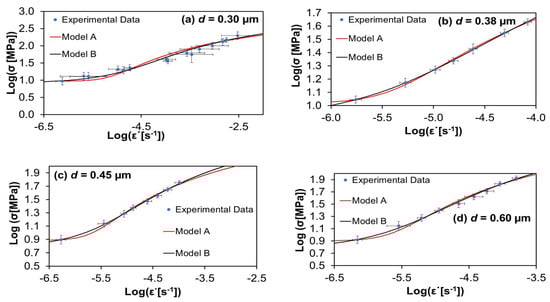 Recalling that for model A and for model B, the experimental data of a number of experiments were adjusted by Equation (16) to obtain the best values for the physical constants: (which depends on structure and grain size), the sensitivity to stress of the activation energy, the critical shear stress for grain sliding and the activation energy .