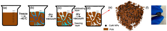 Schematic illustration of the fabrication process: (a) preparation of the composite mixture; (b) freezing the mixture at −40 °C; (c,d) freezing-dry process; (e) cross-linked network of CuNi-PVA; (f) cross-sectional photographic image of the cylindrical CuNi-PVA (80 mg CuNi NPs).
