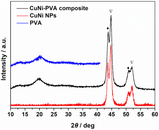 XRD patterns of CuNi NPs, CuNi-PVA composites and PVA. Peaks donated by ◆ and ▽ belongs to Cu-rich and Ni-rich phases, respectively.