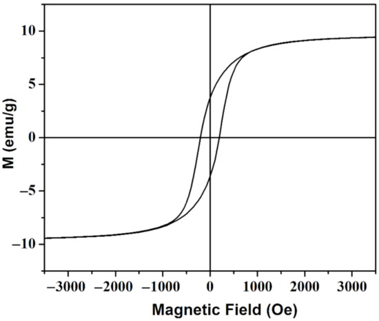 The magnetic property of sample CNP-80 was measured and shown in Figure 5. The sample presents a well-defined hysteresis loop with Ms of 9.35 emu/g and Hc of around 207 Oe. The slight increase in Hc compared to that of the CuNi NPs was due to dipolar interactions that weakened cooperative reversal of the ferromagnetic clusters and tended to increase Hc. When applying an external magnetic field, the relatively low Hc render the CuNi nanoparticles easily demagnetized and remagnetized to the direction of the applied magnetic field. Moreover, the obtained values are comparable with that of the as-reported PVA-Fe3O4 magnetic hydrogel fabricated through freezing-thawing method [15], in which a magnetic sensitive behavior is observed. When applying a magnetic field to CNP-80, a strong magnetic field can be induced in the porous composite, thus, modifying its mechanical property.