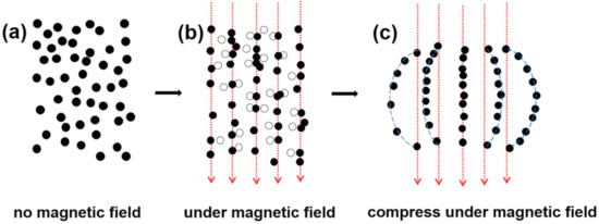 Schematic illustration of magnetic CuNi NPs displacements: (a) initial position; (b) under the action of external magnetic field, (c) under the action of external magnetic field and compression.
