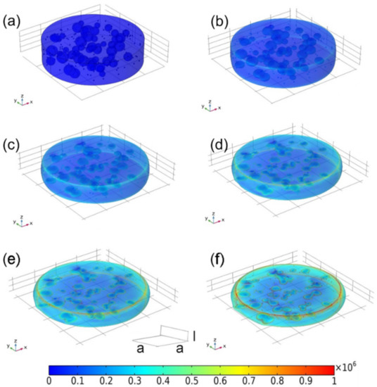 Schematic portrayal of finite element model in a compression process without the action of external magnetic field. The deformation degree is (a) 0%, (b) 20%, (c) 30%, (d) 40%, (e) 50%, (f) 60%. The rainbow bar indicates the compressive stress (unit MPa).