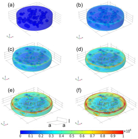 Schematic portrayal of finite element model in a compression process with the action of external magnetic field. The deformation degree is (a) 0%, (b) 20%, (c) 30%, (d) 40%, (e) 50%, (f) 60%. The rainbow bar indicates the compressive stress (unit MPa).