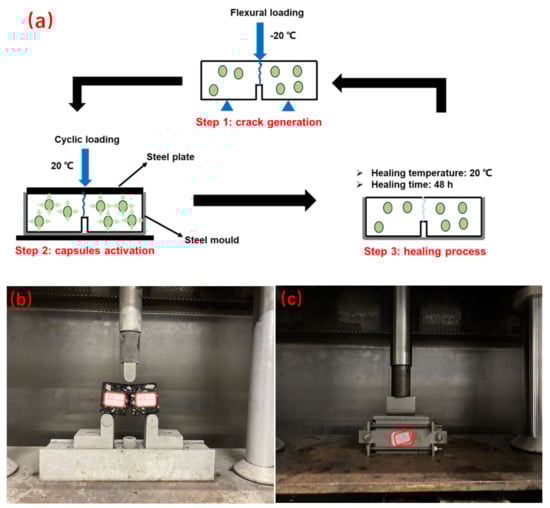 Figure 4. (a) Fracture-cyclic compression loading-healing-fracture test procedure, (b) 3PB test and (c) cyclic loading test.