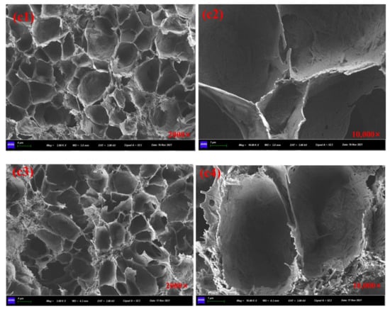 Figure 8a1,a2 showed the SEM images of prepared calcium alginate/attapulgite capsules with multi-chamber structure and the healing agent was encapsulated in disjunctive chambers. The particular rejuvenator storage manner makes capsules own gradual oil release capacity and provides asphalt concrete containing capsules with long-term healing potential. It can be seen from the Figure 9b1,b3, Figure 10c1,c3 and Figure 11d1,d3 that the ageing treatment and cyclic loading will not damage the multi-chamber structure of calcium alginate/attapulgite capsules but will make the chamber wall become rough, which can be observed from Figure 9b2,b4, Figure 10c2,c4 and Figure 11d2,d4. The reason could be that the thermal treatment and compression loading make the capsules release encapsulated oil and lose the smoothness due to the leak-out of oil. Furthermore, the high temperature action may separate attapulgite from wall of the capsules.