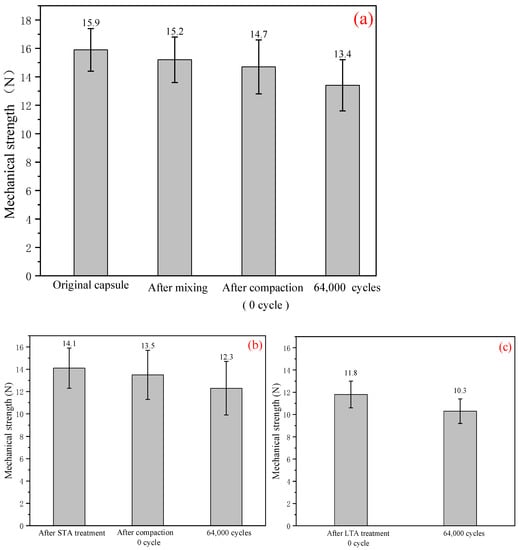 Figure 12 showed the mechanical strength of capsules in asphalt mixtures with different levels of ageing treatment. The strength of capsules within fresh asphalt concrete after mixing, compaction and cyclic loading were presented in Figure 12a. It can be seen that the strength of capsules decreased from 15.9 N to 15.2 N and 14.7 N after mixing and compaction, respectively, which indicated that the capsules would lose little strength during the manufacturing process of asphalt mixture. The strength of capsules in asphalt mixture beam after 64,000 cycles of compressive loading was 13.4 N. This implied that the cyclic compression loading would decrease partly the strength of capsules, which was related to the release of the oil from the capsules.
