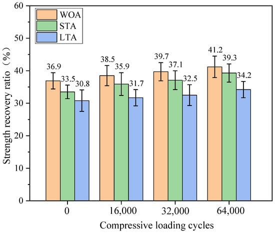 Figure 16. Strength recovery ratios of test beams without capsules with different ageing levels after cyclic compression loading.