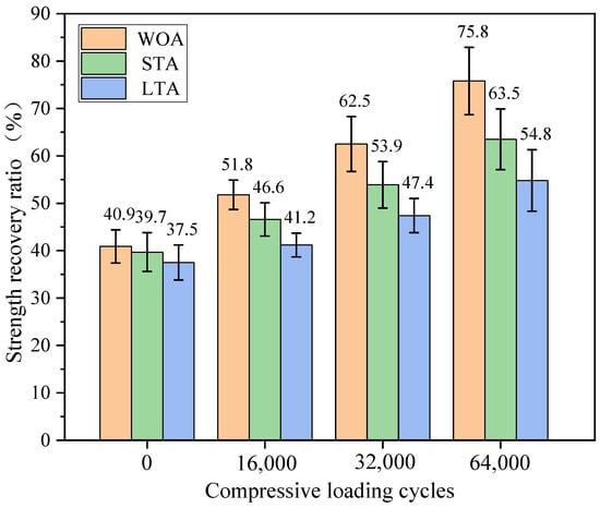 The strength recovery ratios of fresh and aged asphalt mixture beams all slightly increased with the increase of compression loading cycles. The fractured asphalt mixture beams in steel mold were gradually compacted and the width of crack zone slightly decreased with the cycles of compression loading, thus slightly enhancing the strength recovery ratios of the three types of asphalt mixture beams without capsules. Furthermore, the strength recovery ratios of test beams decreased with the increase of the ageing level of asphalt mixtures after fixed compression loading cycles. For example, the strength recovery ratios of the three types of test beams were 41.2%, 39.3% and 34.2%, respectively, after 64,000 cycles of compression loading. The ageing treatments make the asphalt binder become stiffer and increase the viscosity, thus decreasing the capillary flow of asphalt in crack zone.